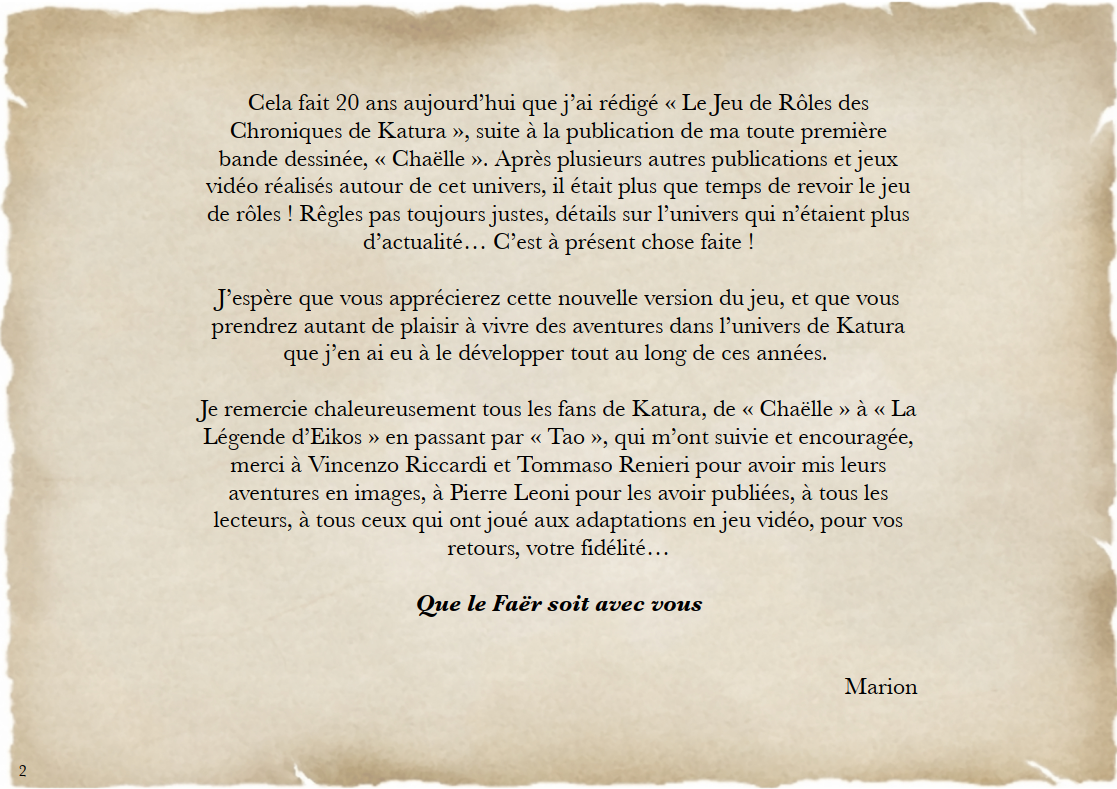 Il s'agit d'une version entièrement revue et corrigée du Jeu de Rôles des Chroniques de Katura publié en 2004 par l'association Lupus Ideis.