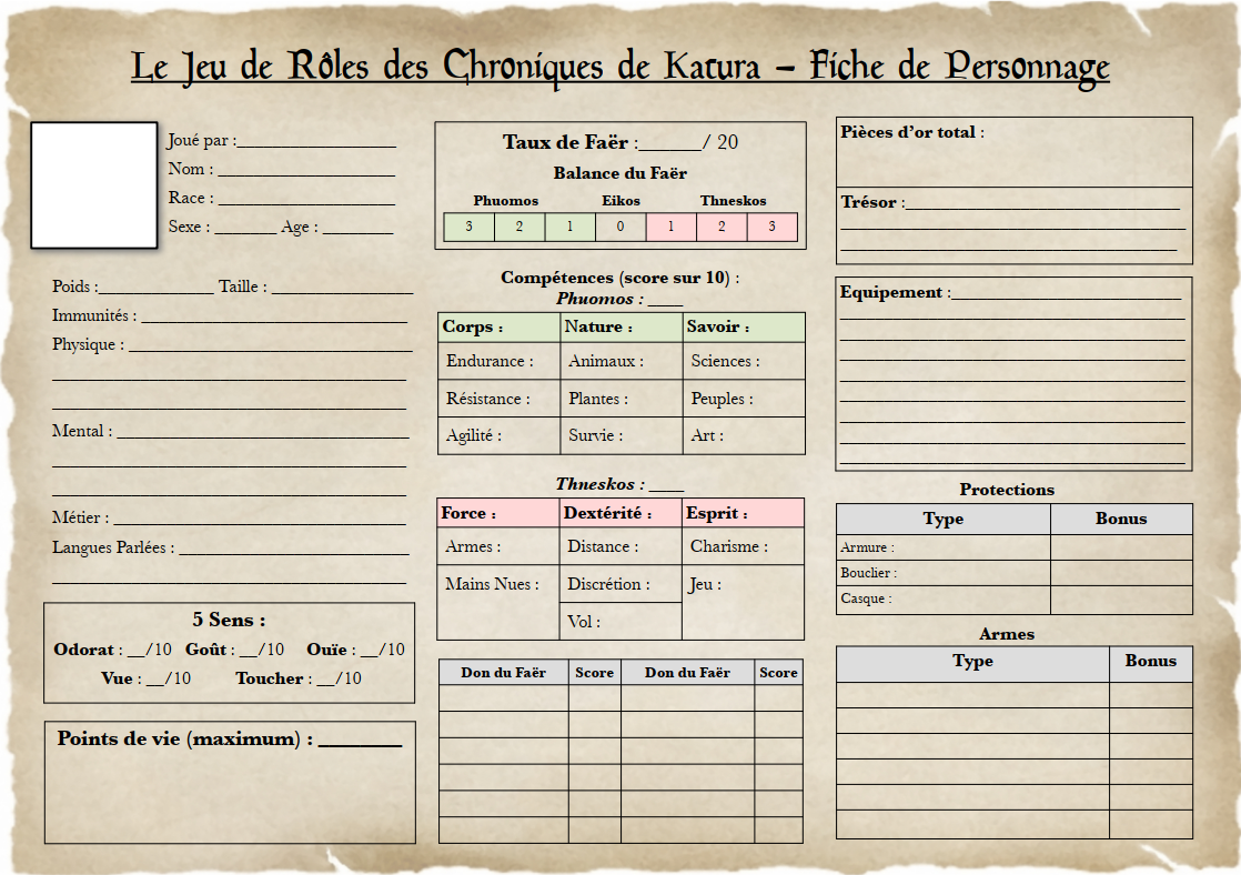 Rassemblez vos amis, munissez-vous d'une imprimante, de crayons et de dés à 6 faces, créez vos personnages en choisissant parmi de nombreuses espèces jouables, et partez ensemble à la rencontre des peuples de Katura, à la découverte des mystères qui se cachent au plus profond des terres, et bien plus encore !